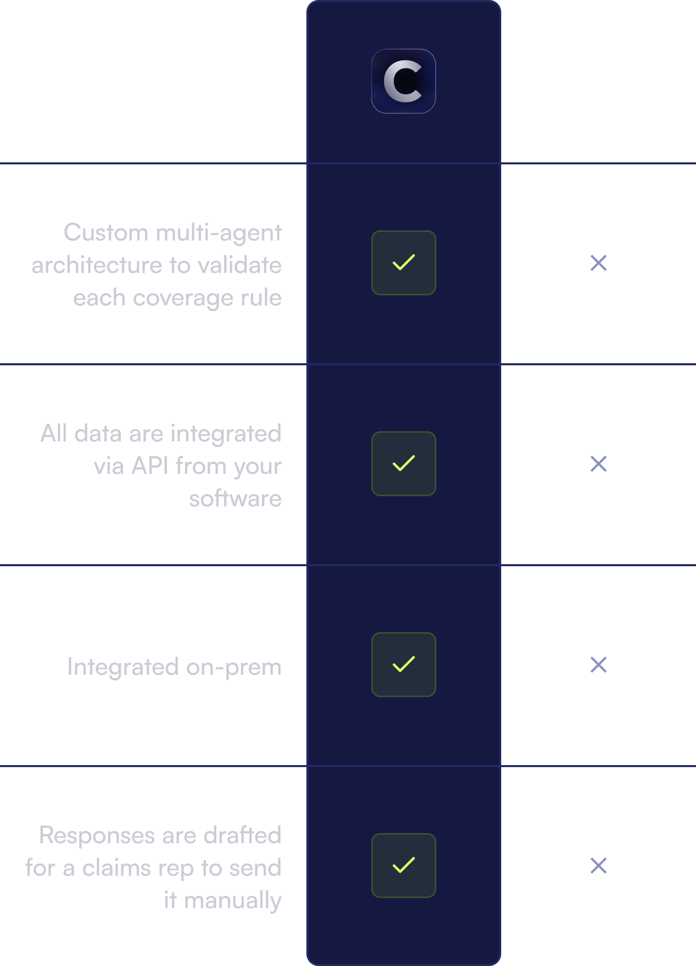 Every coverage condition is validated by a single, specifically configured AI agent, to ensure the decision accuracy.